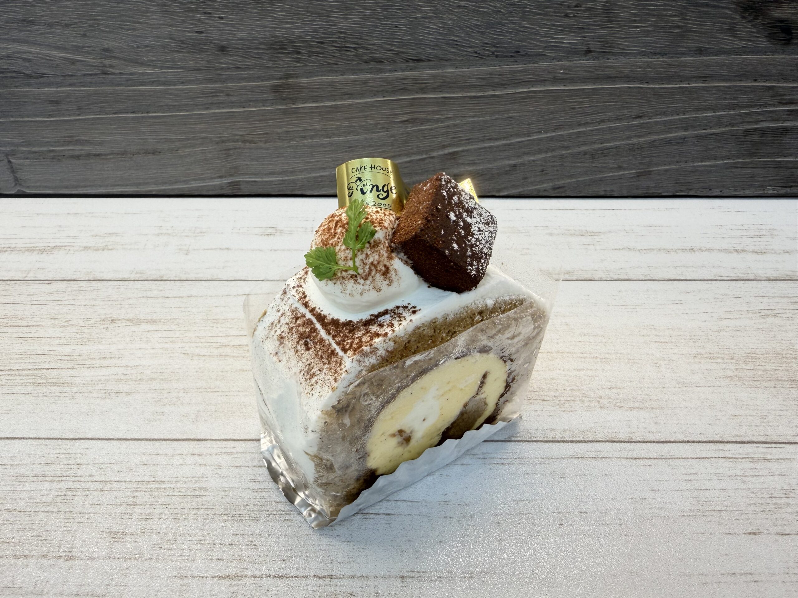 マスカルポーネのムースを、コーヒー味の生地で巻きました。