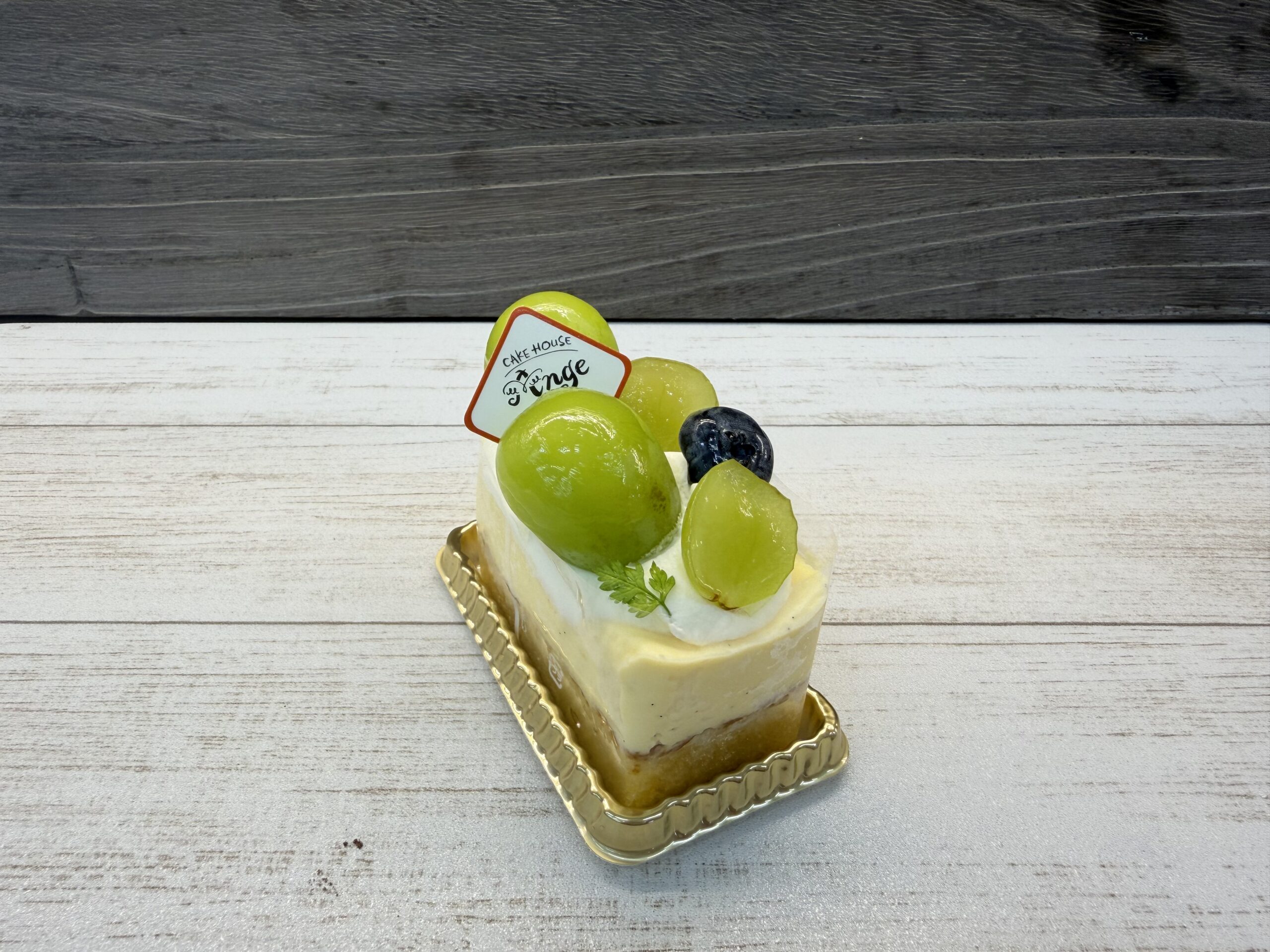 ホワイトチョコブラウニーにカスタードムースとシャインマスカットで仕上げました。