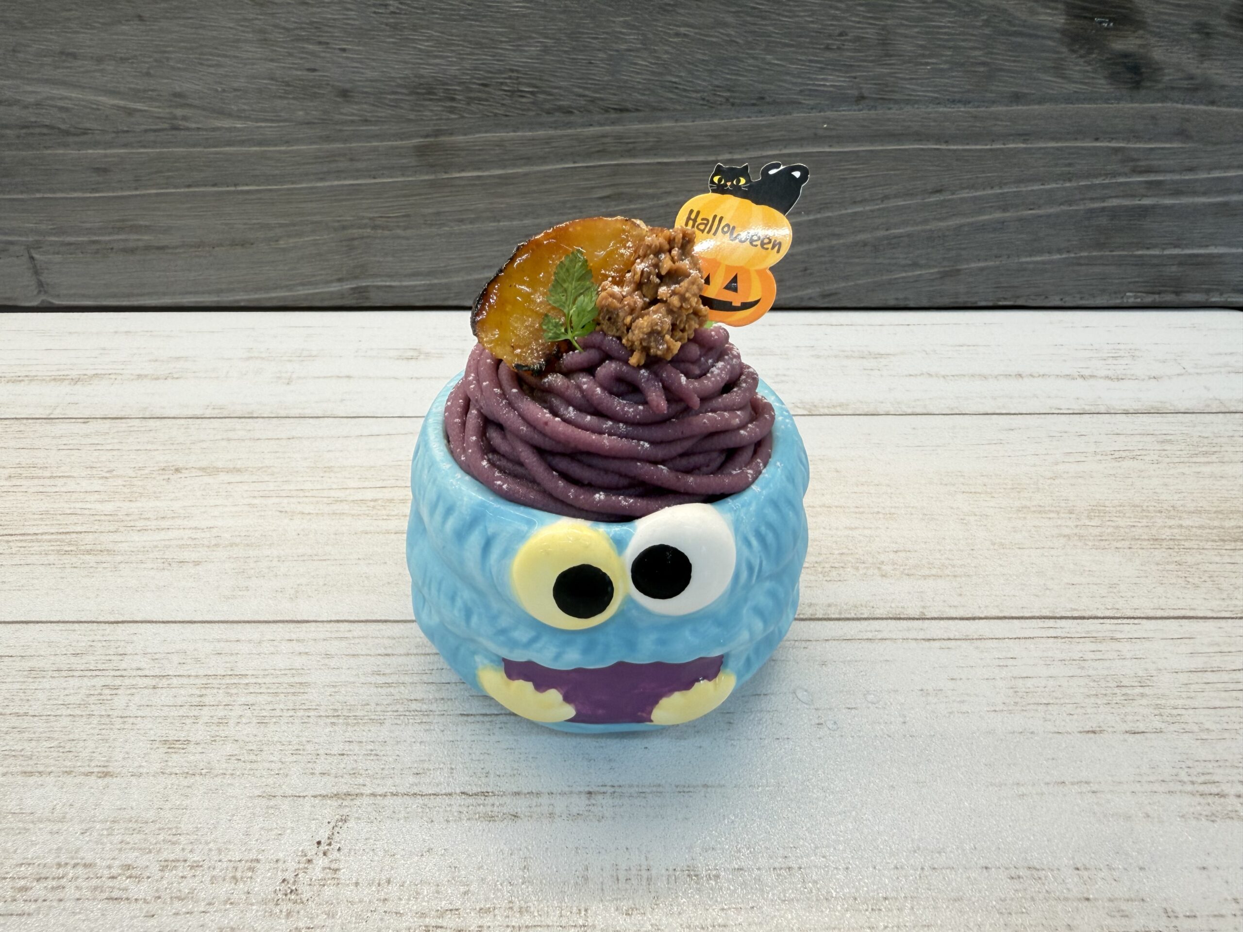 チョコレートムース・クランチ・キャラメルの上に紫芋クリームを絞りました。